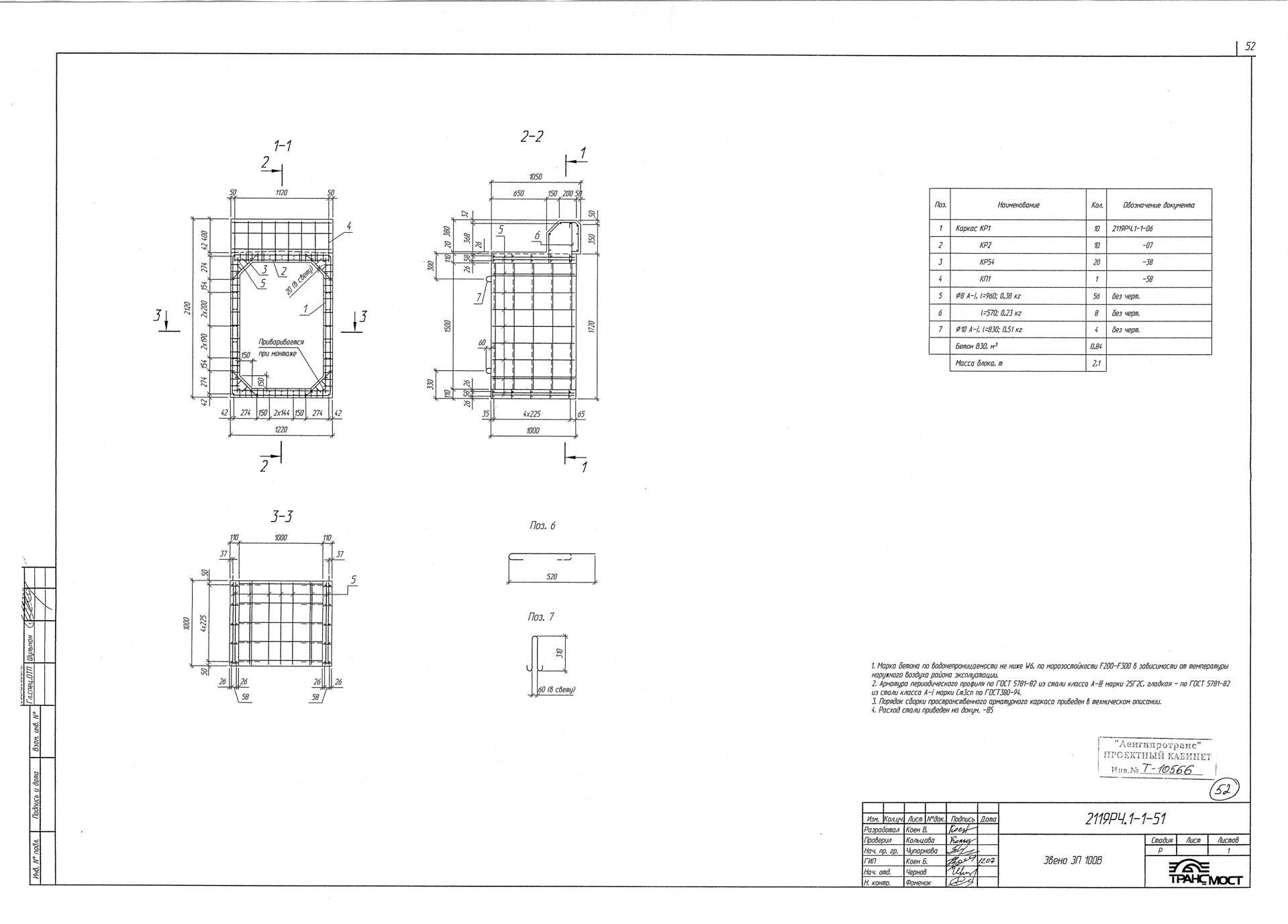 Трубы водопропускные и оголовка ЗП 100В для прямоугольных водопропускных труб изготавливаются в соответствии с ГОСТ 24547-81 «Звенья железобетонные водопропускных труб под насыпи автомобильных и железных дорог», ОСТ 35-27.0-85 «Звенья железобетонные круглых и прямоугольных водопропускных труб под железные и автомобильные дороги» из тяжелого конструкционного бетона. Класс бетона по прочности на сжатие принимается не ниже В15. Класс бетона по морозостойкости назначается в зависимости от климатического района строительства не ниже: F200 – при средней месячной температуре воздуха наиболее холодного месяца в районе строительства выше -15˚С; F300 – при средней месячной температуре воздуха наиболее холодного месяца в районе строительства ниже -15˚С. Класс бетона по водонепроницаемости принимается не менее W6. Дополнительно в бетонную смесь изделий вводятся вохдухововлекающие, газообразующие и пластифицирующие добавки для сопротивления воздействию агрессивных химических веществ, содержащихся в воде и грунте.