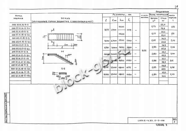 Элементы лестниц – лестничные марши ЛМП 57.11.18-5-3 железобетонные – изготавливаются из тяжелого бетона плотностью 2500 кг/м3 по ГОСТ 26633 или из легкого бетона плотной структуры средней плотностью от 1600 до 2000 кг/м3 по ГОСТ 25820. Класс бетона изделий по прочности на сжатие выбирается в зависимости от назначения лестницы: В25 – наружные лестницы зданий и сооружений, а также лестницы из тяжелого бетона или плотного силикатного бетона, предназначенные для внутренних лестниц жилых зданий высотой до 5 этажей; В15 – лестницы для остальных зданий и сооружений.